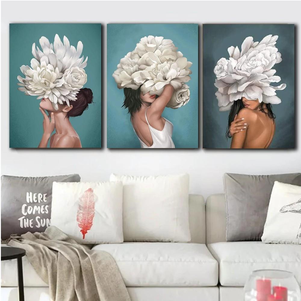 Set tablouri living sau dormitor femei cu flori albe si albastru design interior decoratiuni casa panza canvas pe sasiu lemn HIDDEN WOMAN