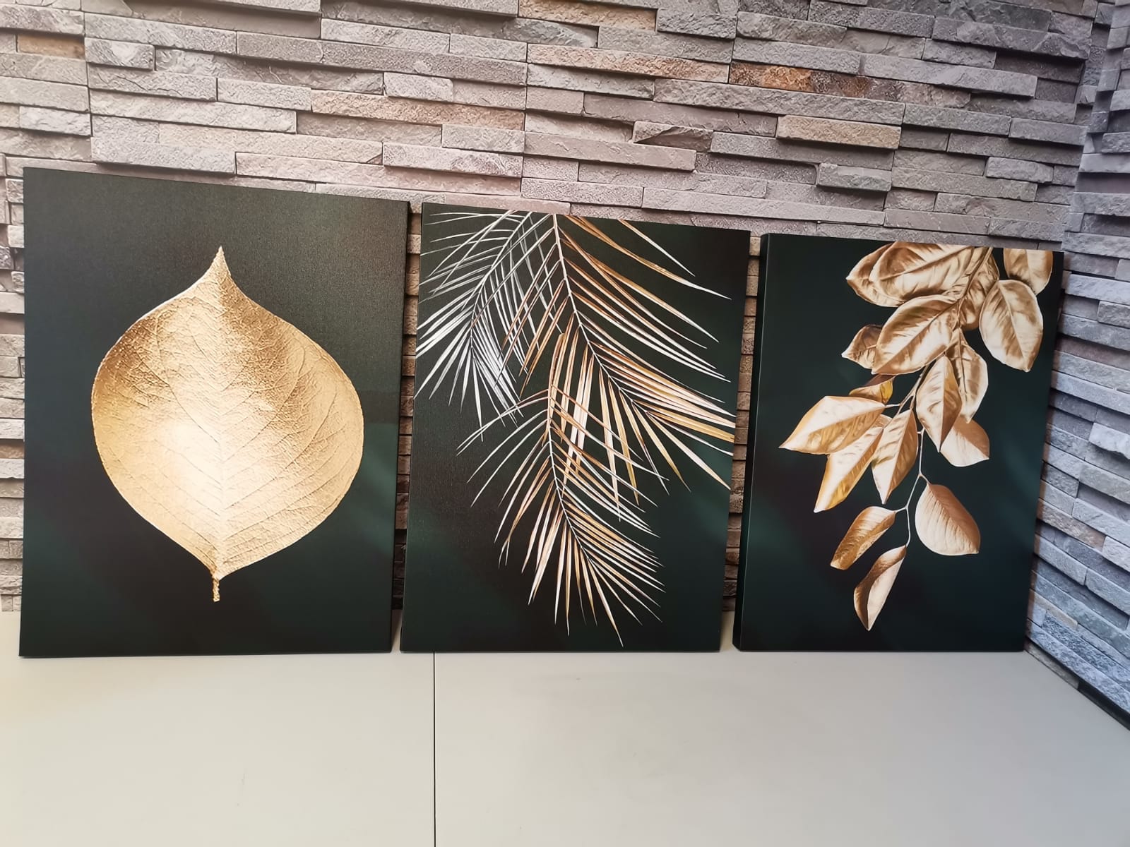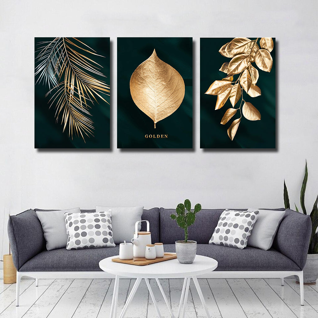 Set tablouri canvas floral moderne abstracte design interior elegant decoratiuni living sau dormitor verde cu auriu GOLDEN LEAF WALL ART