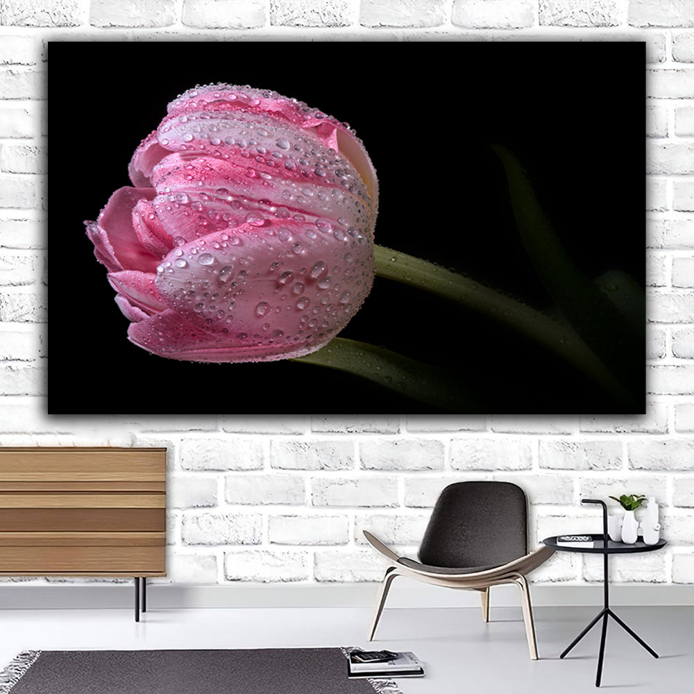 Tablou canvas cu lalea roz acoperita de roua pe fundal negru
