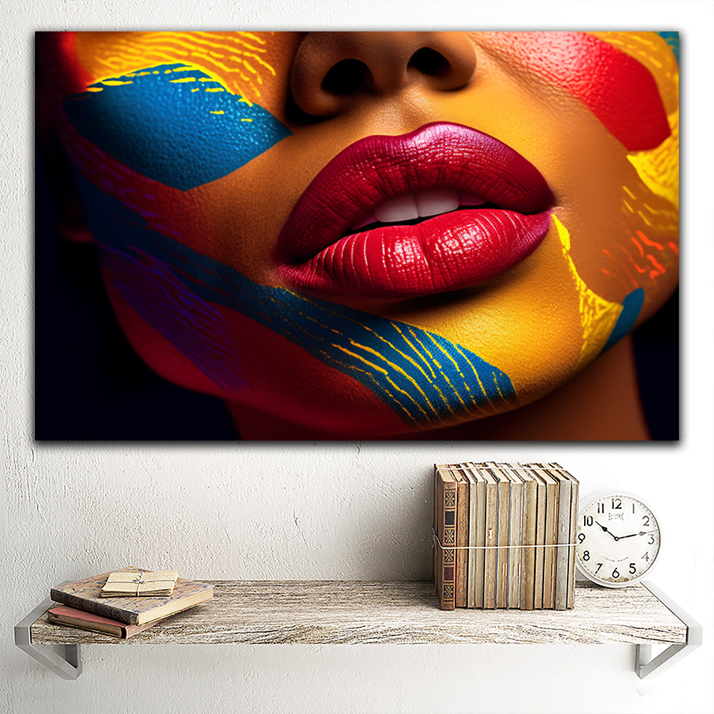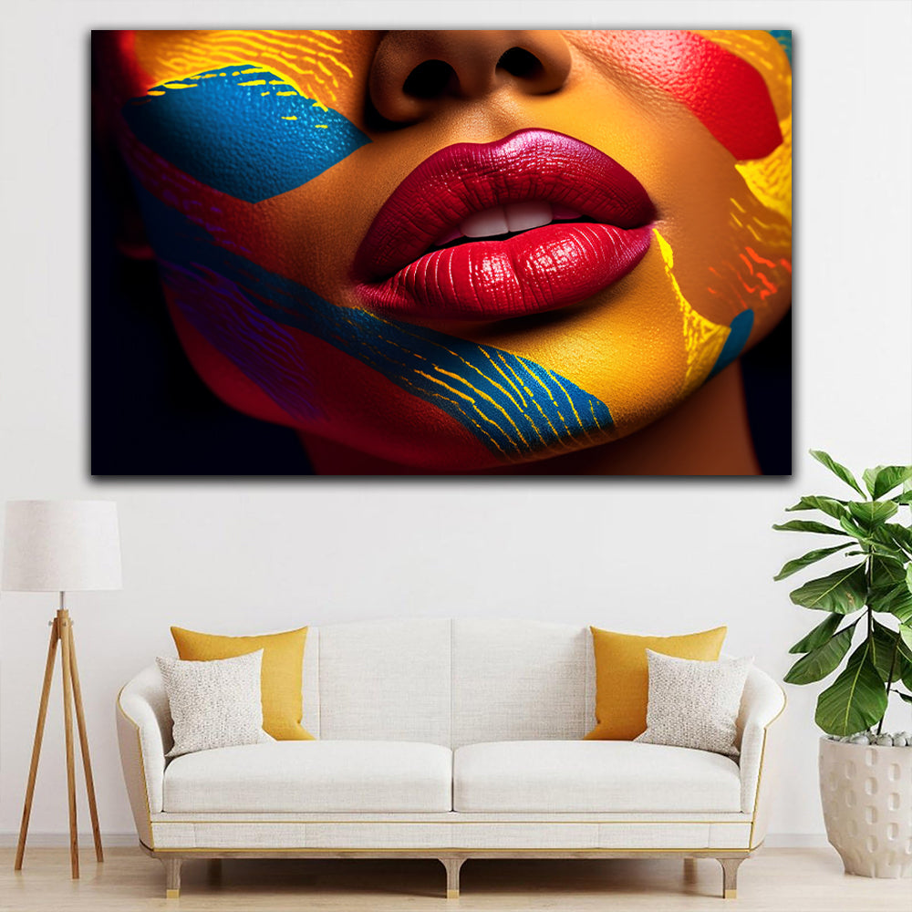 Tablou canvas femeie cu buze rosii si fata acoperita de culori