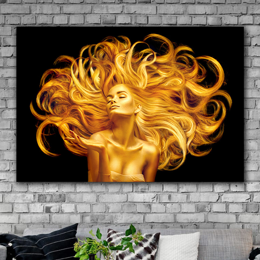 Tabloul femeie cu parul auriu si fundal negru in nuante Black and Gold aduce în prim-plan nuanțe vibrante cu un design modern și elegant, acest tablou este perfect pentru a completa atmosfera din living sau birou. Fabricat cu mândrie în România, aduce un strop de rafinament și originalitate în spațiul tău.