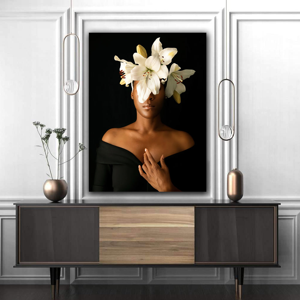 Adaugă o notă de sofisticare și frumusețe înconfundabilă livingului tău cu tabloul nostru floral canvas , Femeie cu Crini Albi. Acestă piesă de artă captivantă prezintă o imagine evocativă și profundă a unei femei, înfășurată în mister și grație, cu crini albi delicat așezați în cap, contrastând sublim motive florale cu un fundal negru intens. Perfect pentru iubitorii de design interior modern, acest tablou adaugă o dimensiune vizuală unică și un accent de wall decor de neuitat oricărui spațiu.