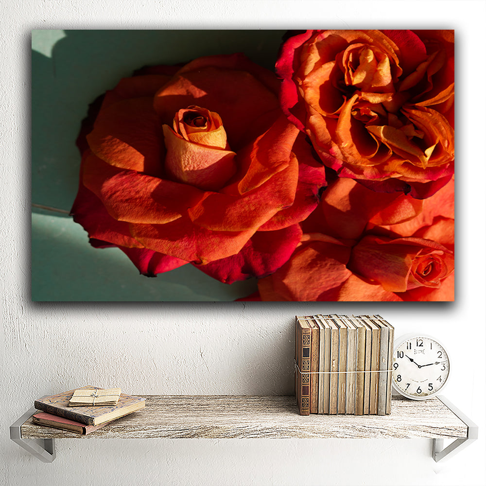 Tablou canvas flori de trandafir rosu cu portocaliu in razele soarelui