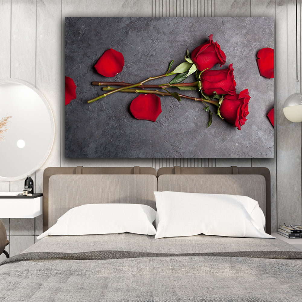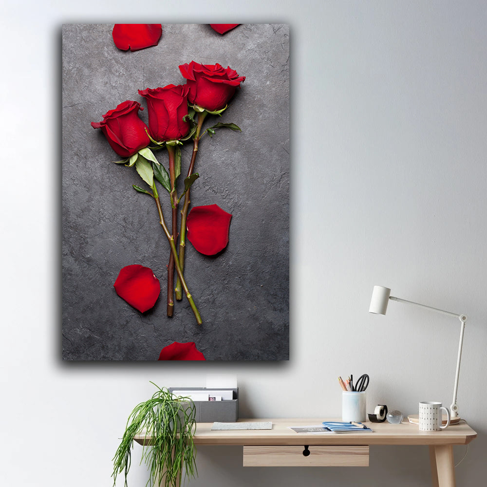Tablou canvas trei fire de trandafiri rosii inconjurati de petale