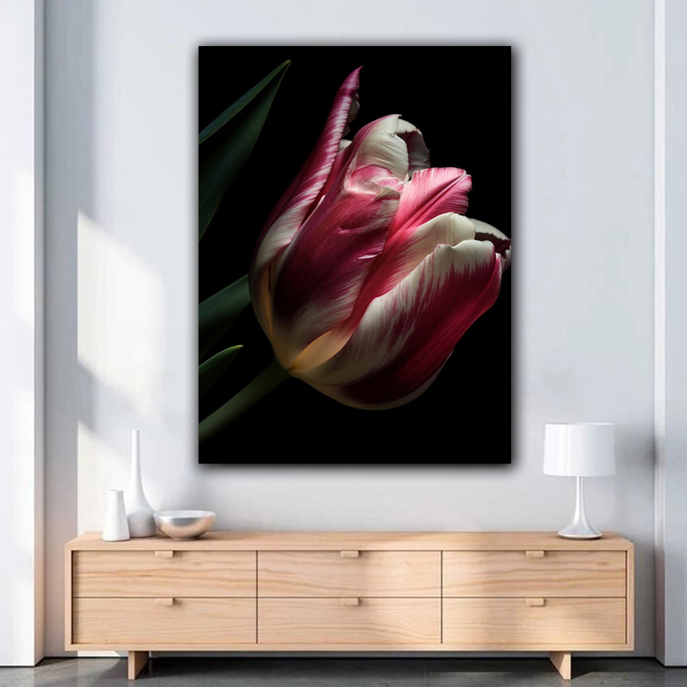 Tablou canvas lalea alba cu rosu in lumina naturala pe fundal negru
