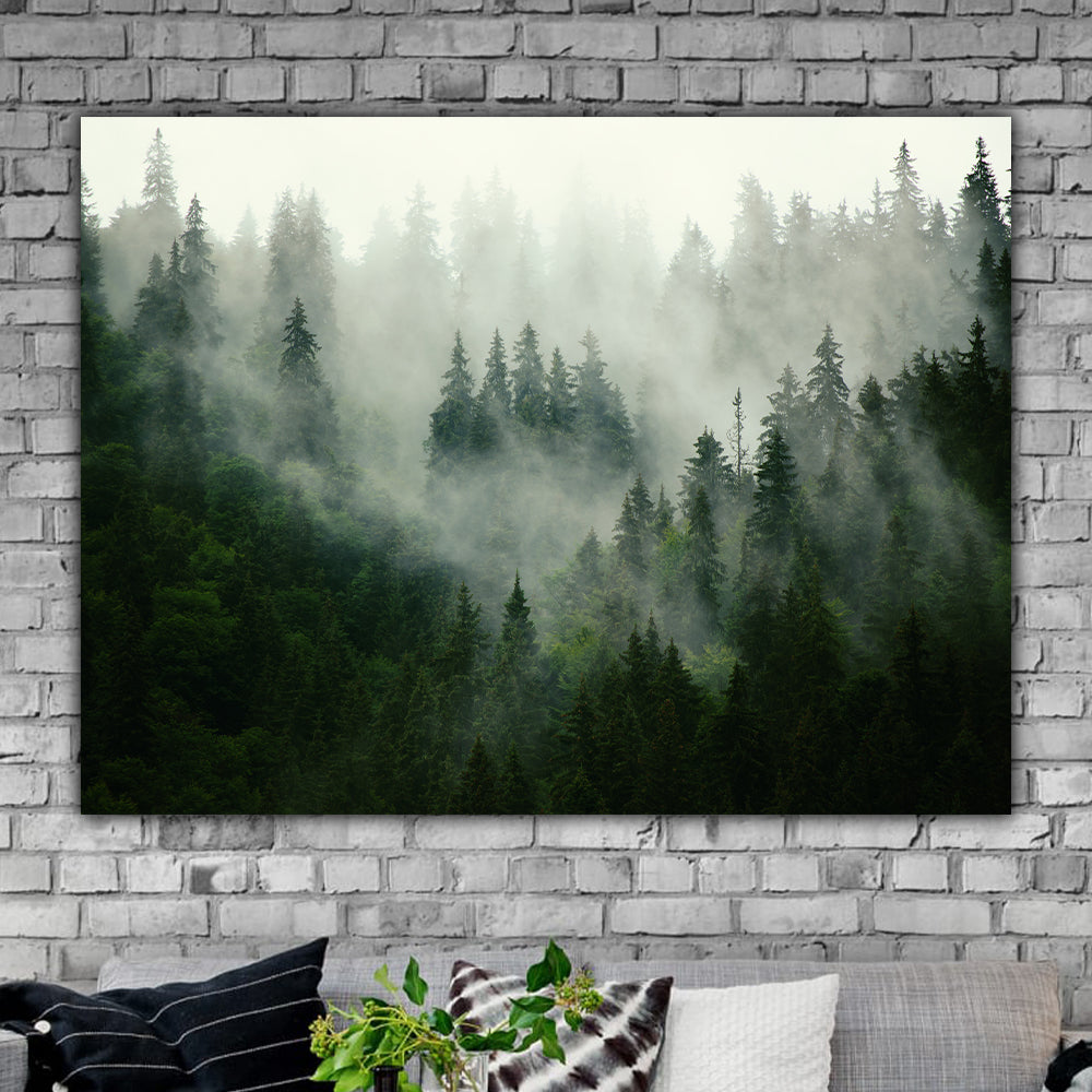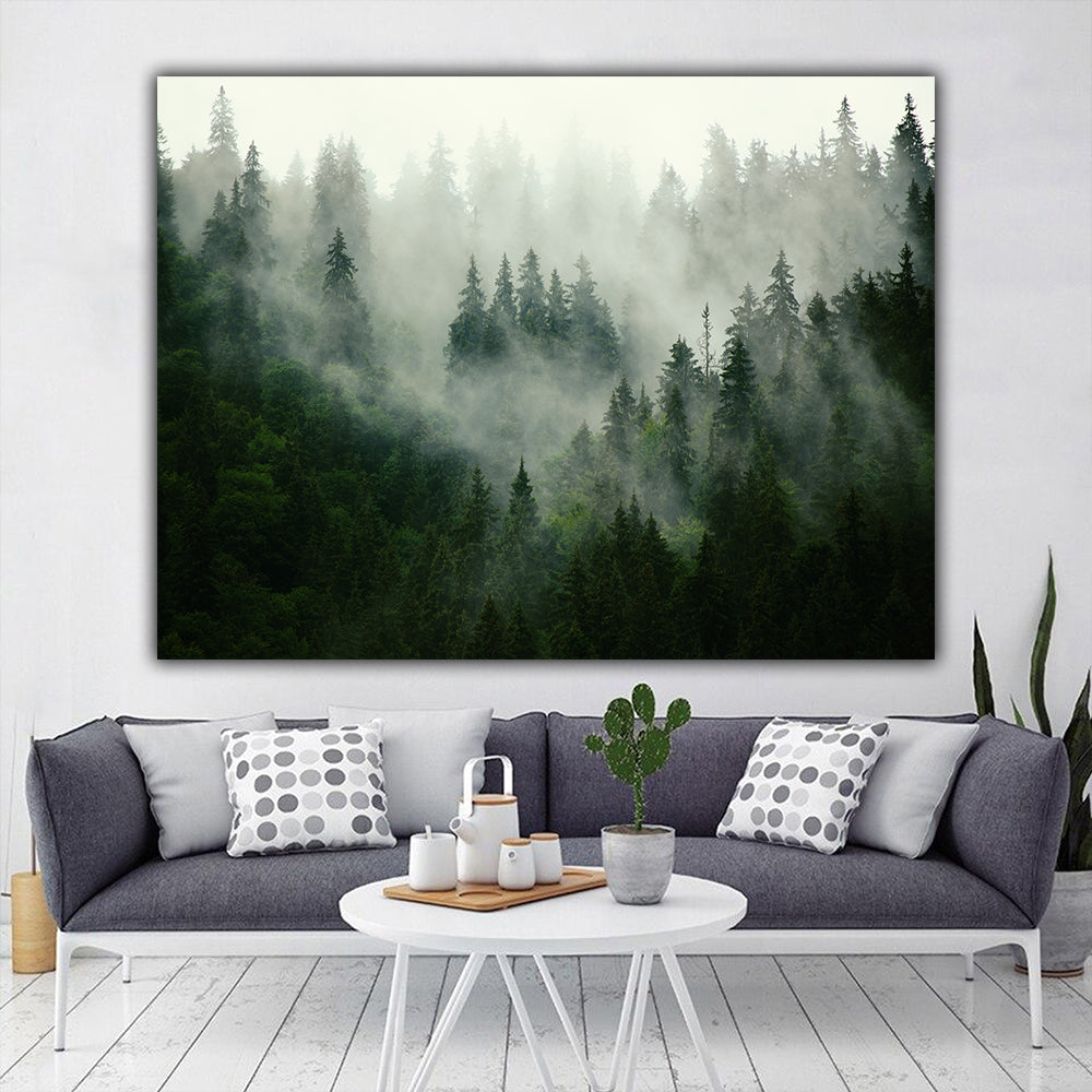 Tablou canvas peisaj padure de conifere brazi acoperita de ceata in mijlocul muntilor