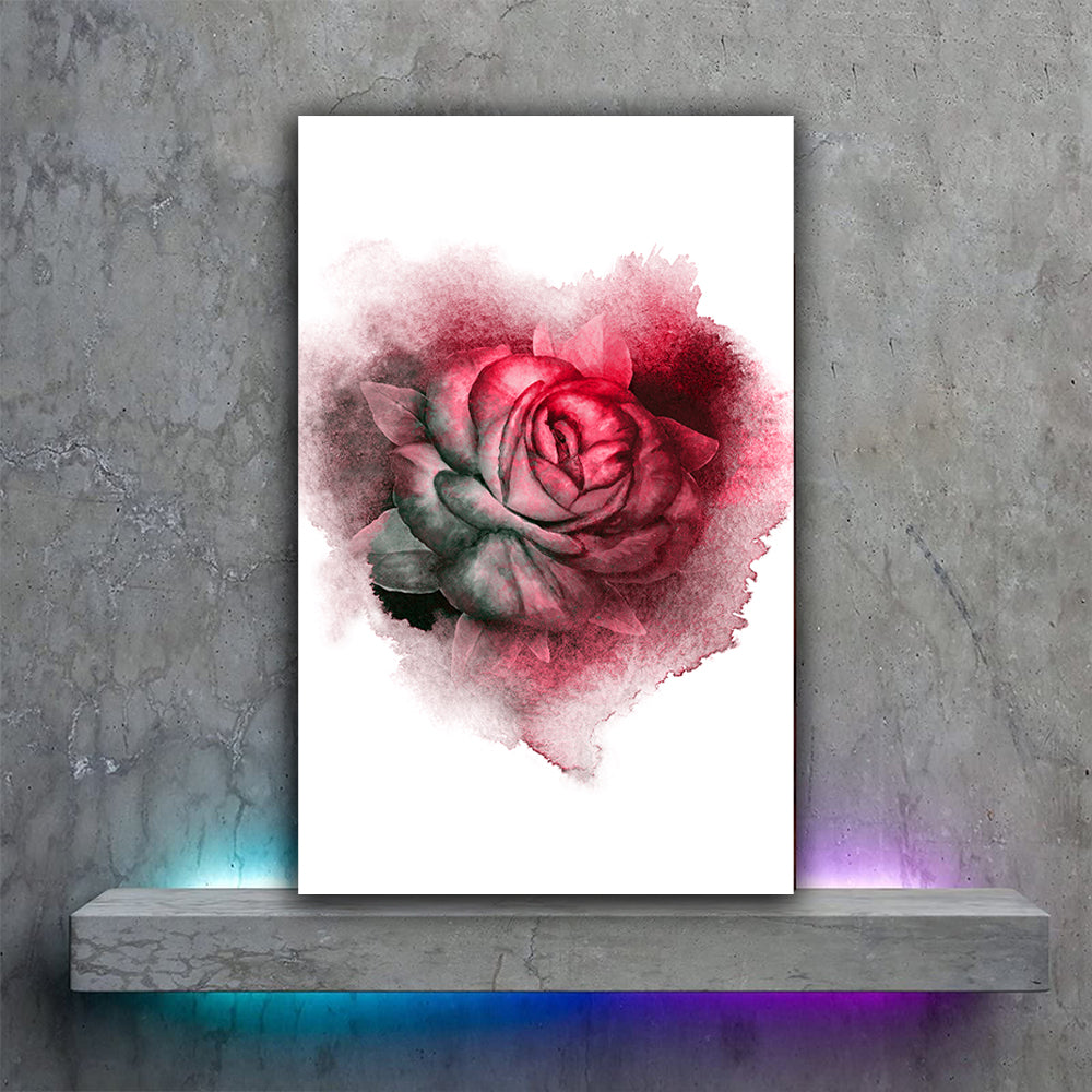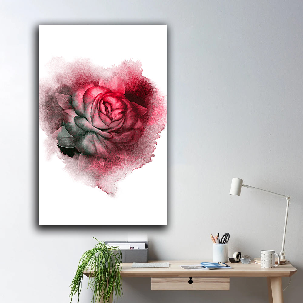 Tablou canvas trandafir rosu cu frunze verzi pierdut in fundalul alb